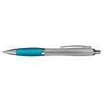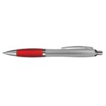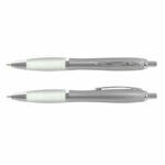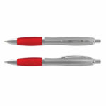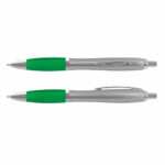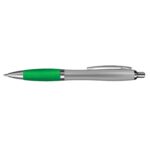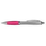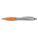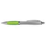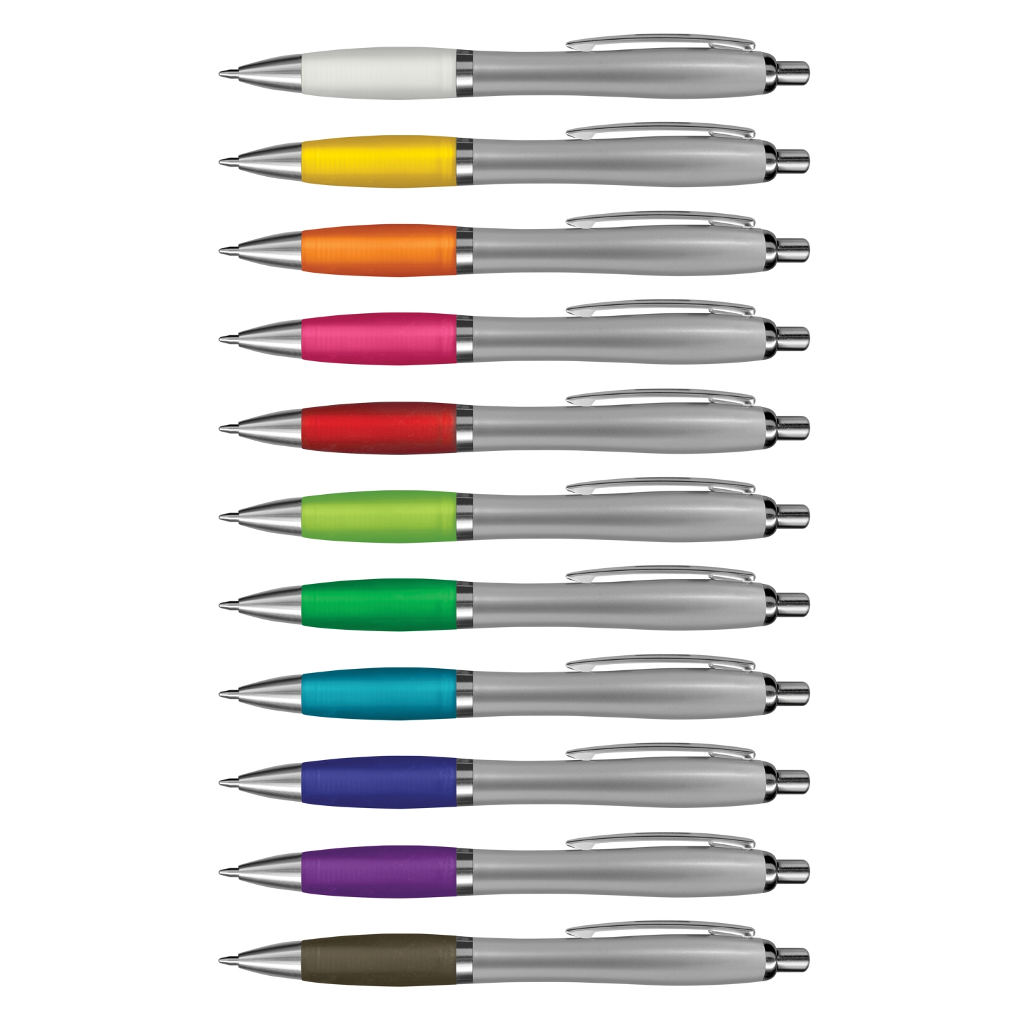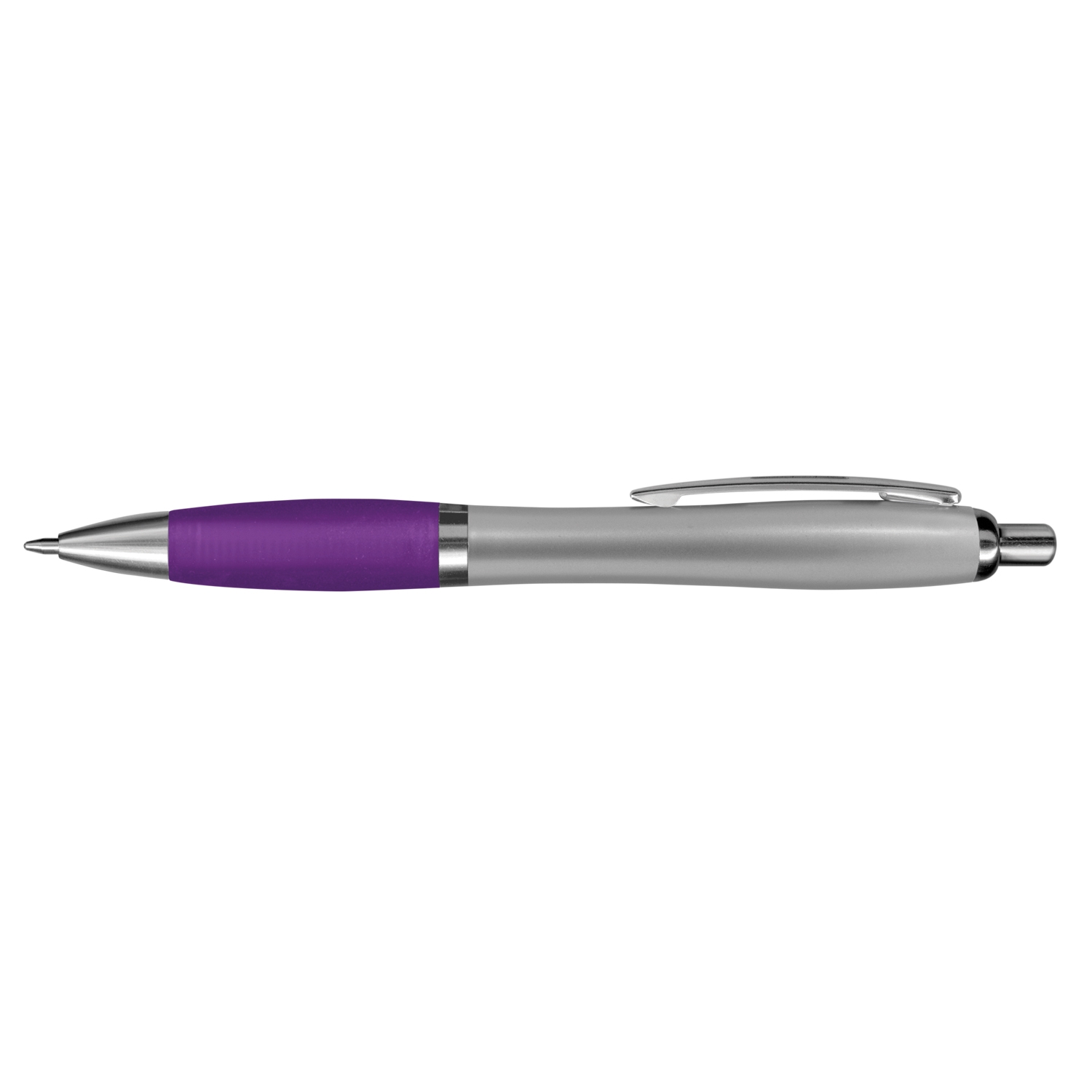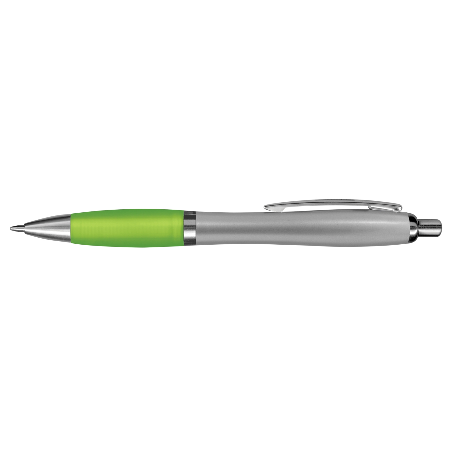 Retractable plastic and metal ball pen with a Silver barrel, a frosted translucent soft touch rubber lacquered grip and shiny Chrome accents. It has a Black ink TRENDS Large Volume refill with 1800 metres of German manufactured DOKUMENTAL ink and a tungsten carbide ball for improved writing quality. Blue ink is available for an additional charge. . Decoration options: Pad Print | Direct Digital