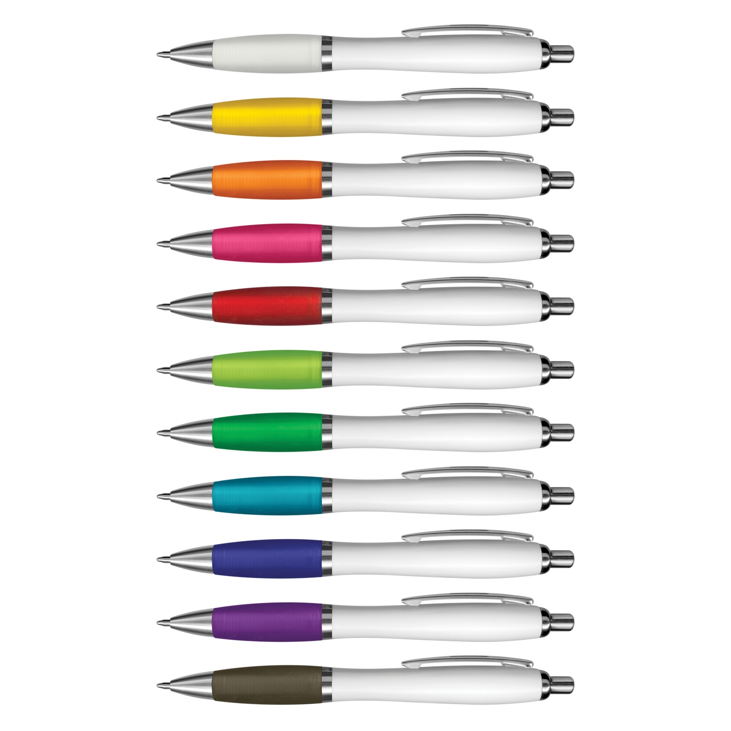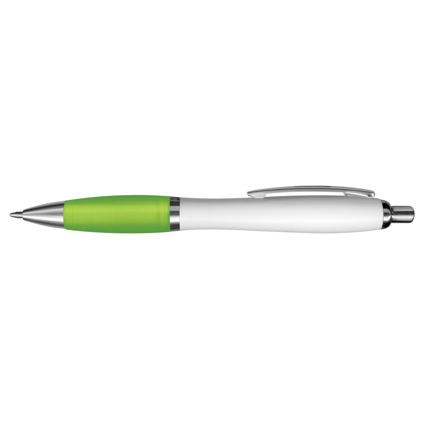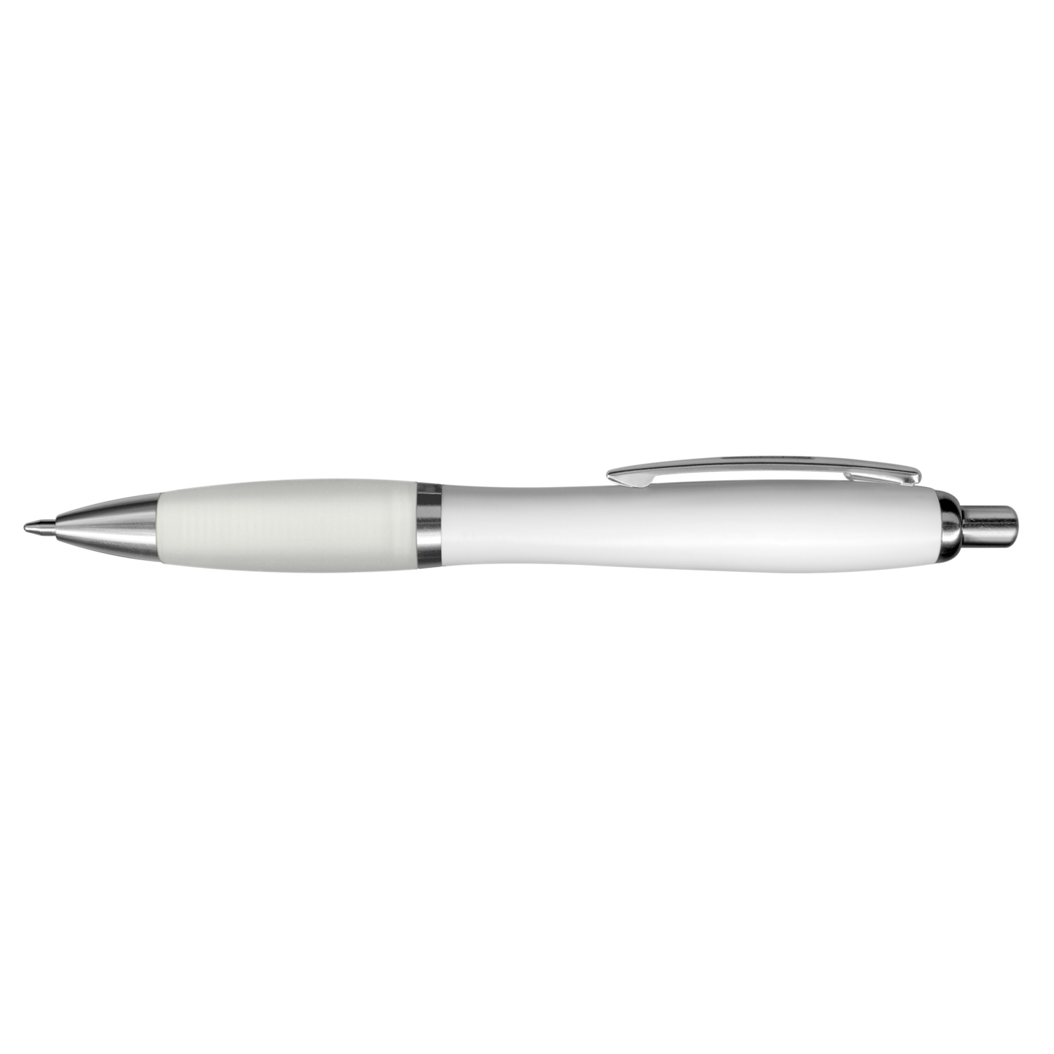 Retractable plastic and metal ball pen with a white barrel, a frosted translucent soft touch rubber lacquered grip and shiny Chrome accents. It has a Black ink TRENDS Large Volume refill with 1800 metres of German manufactured DOKUMENTAL ink and a tungsten carbide ball for improved writing quality. Blue ink is available for an additional charge. . Decoration options: Pad Print | Direct Digital