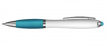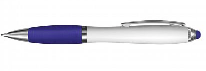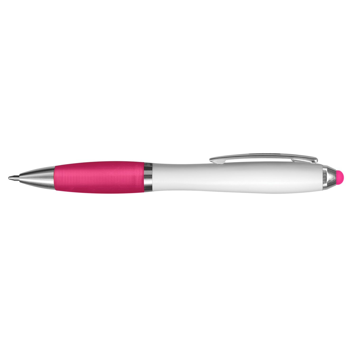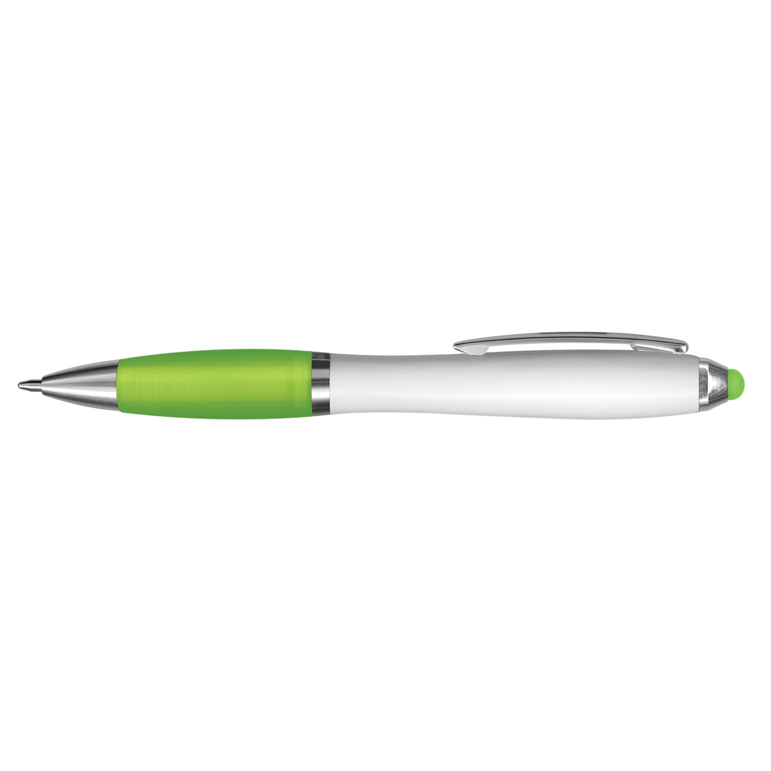 Twist action plastic and metal ball pen with a White barrel, a frosted translucent soft touch rubber lacquered grip, shiny Chrome accents and a stylus for use with touch screens. It has a TRENDS Black ink refill with 1200 metres of German manufactured DOKUMENTAL ink and a tungsten carbide ball for improved writing quality. . Decoration options: Pad Print | Direct Digital