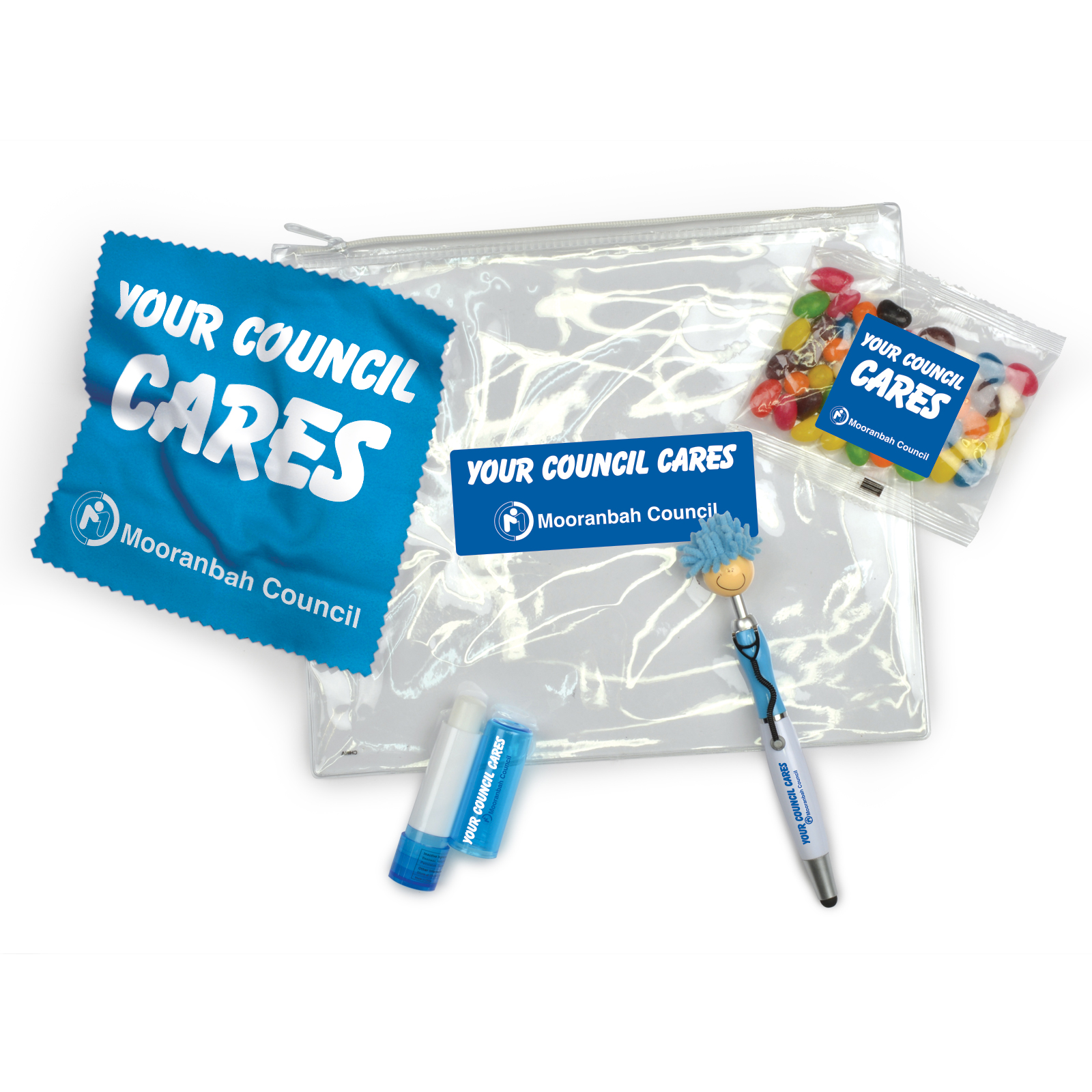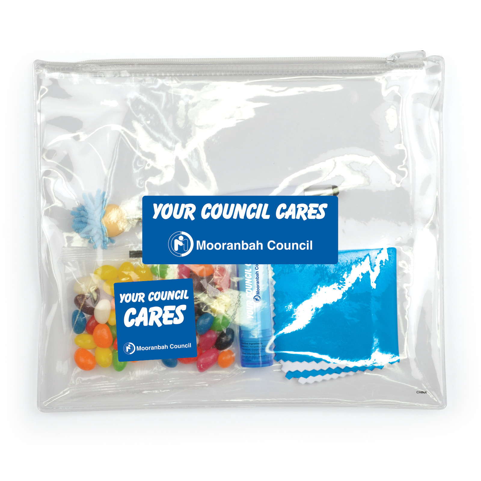 Wellness pack with Doctor Mop Top Pen, Lip Balm Stick, Microfibre Lens Cloth and 50 grams of Jelly Beans in clear pencil case.Includes items: Mop Top Doctor Pen /Stylus, Lip Balm Stick, Assorted Colour Mini Jelly Beans in 50 Gram Cello Bag, Zig Zag Economy Microfibre Lens Cloth, Delight Pencil Case. Note: Mop Top: Light Blue; Lip Balm: White, Yellow, Orange, Red, Pink, Light Green, Light Blue, Dark Blue, Black; Jelly Beans: Assorted; Lens Cloth: White; Pencil Case: Clear