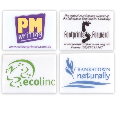White rectangular rubber eraser with a great print area for your logo or copy. A must for every stationery set!