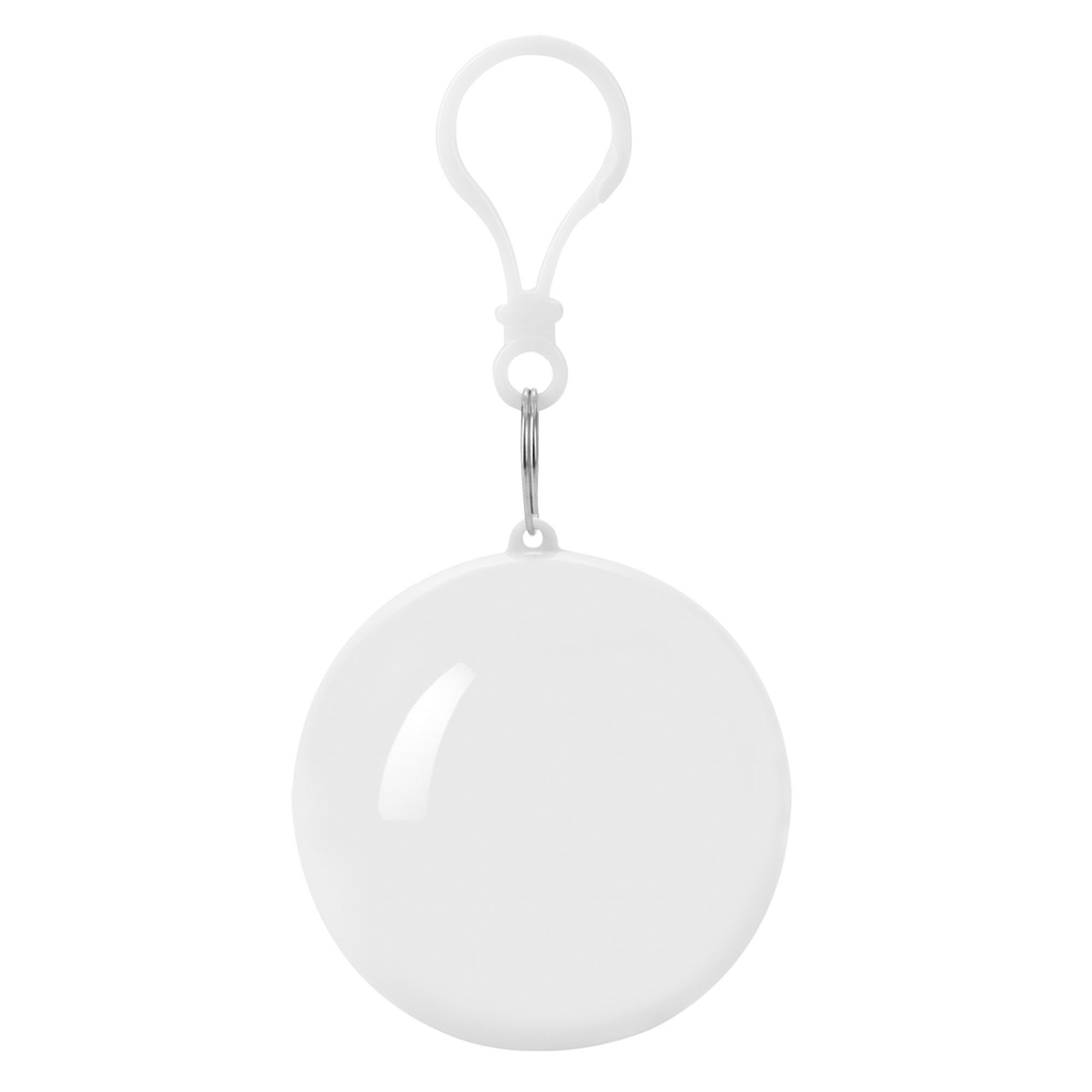 Handy translucent white reusable poncho with a hood folds into a plastic ball which is twist closure, one size fits all. A white carabiner clip attached.