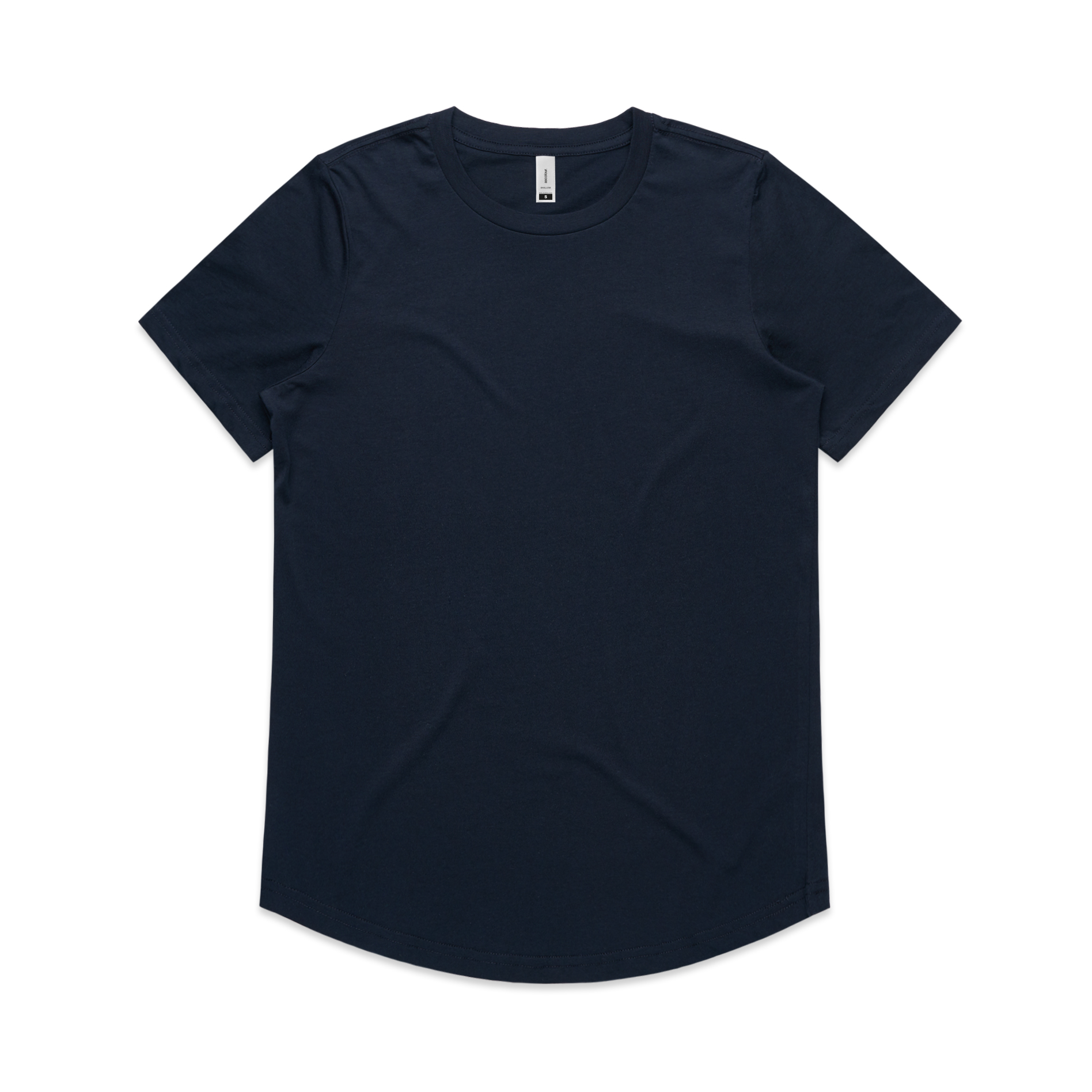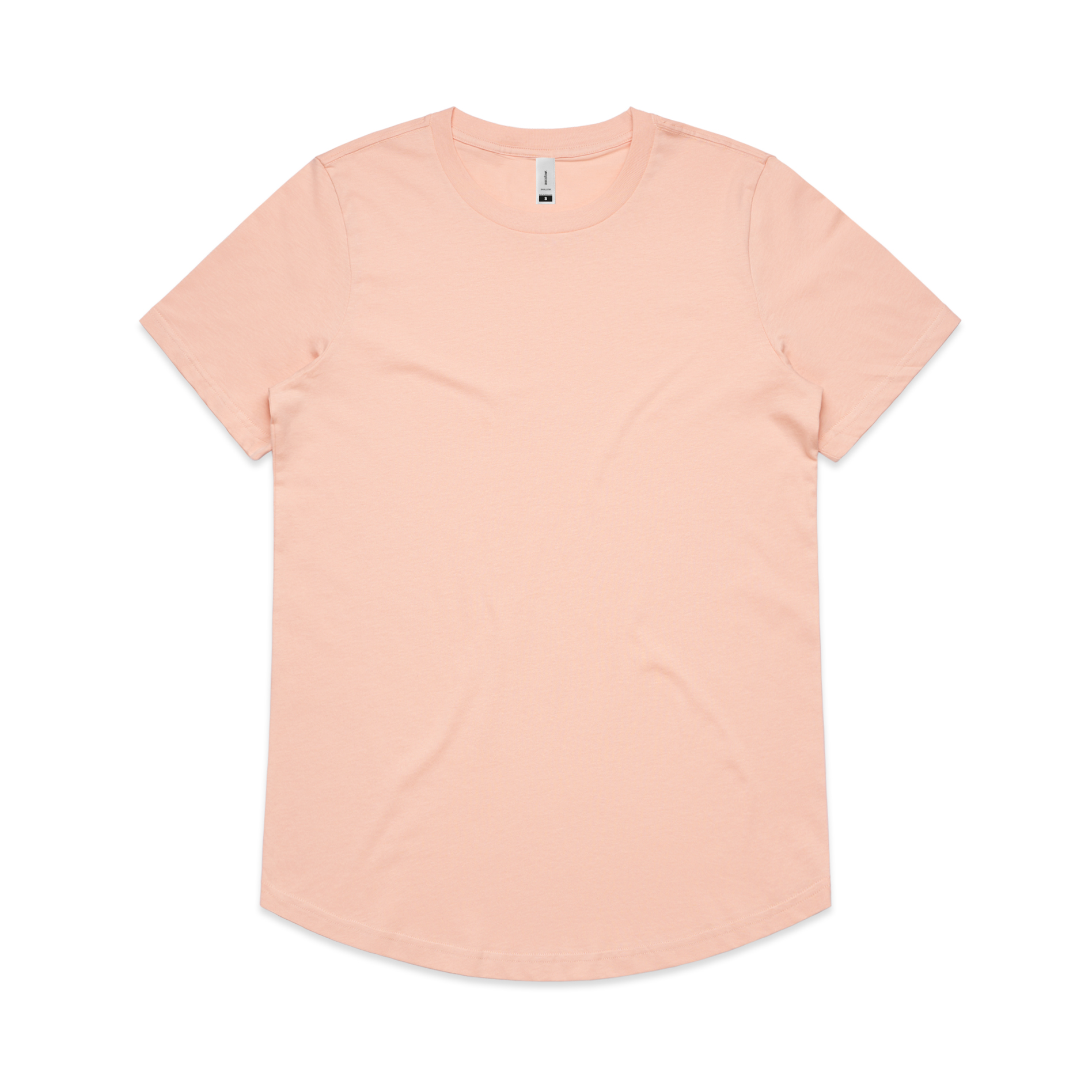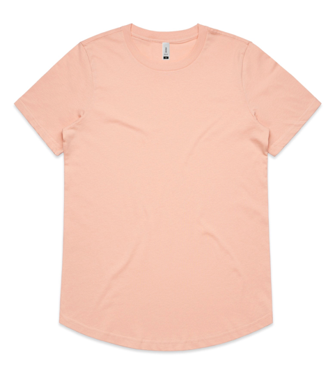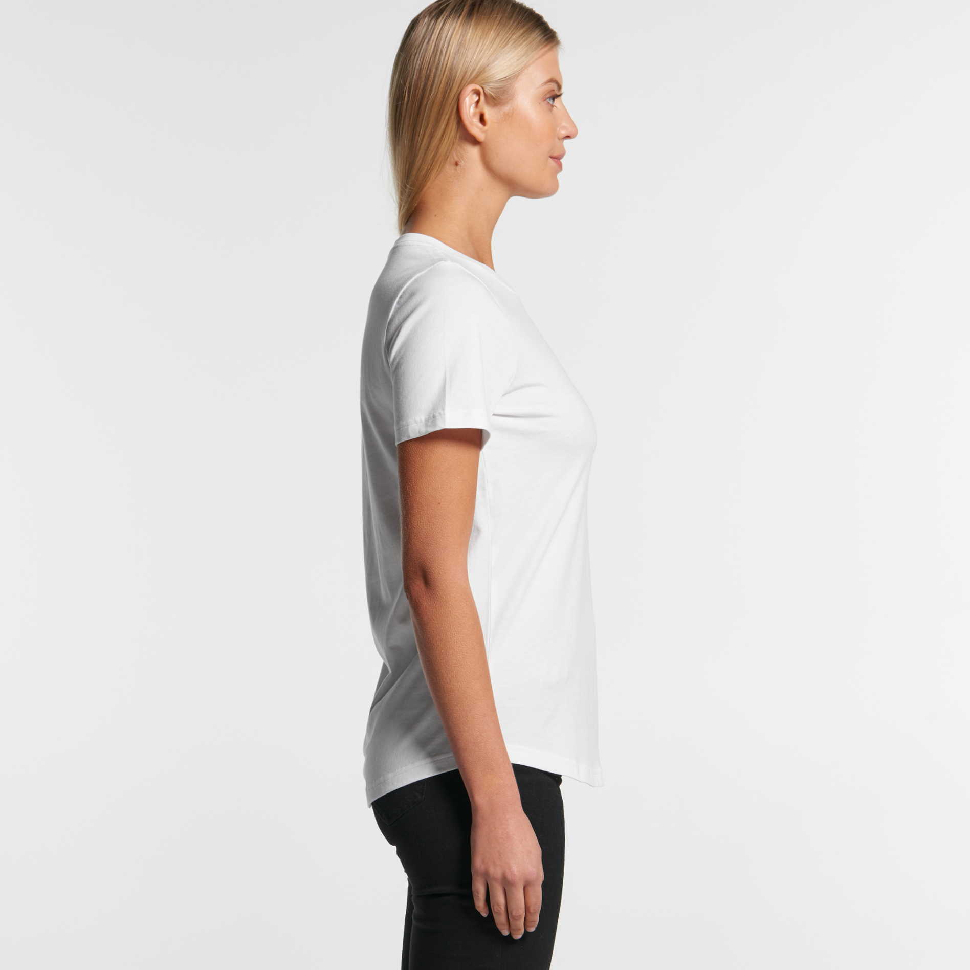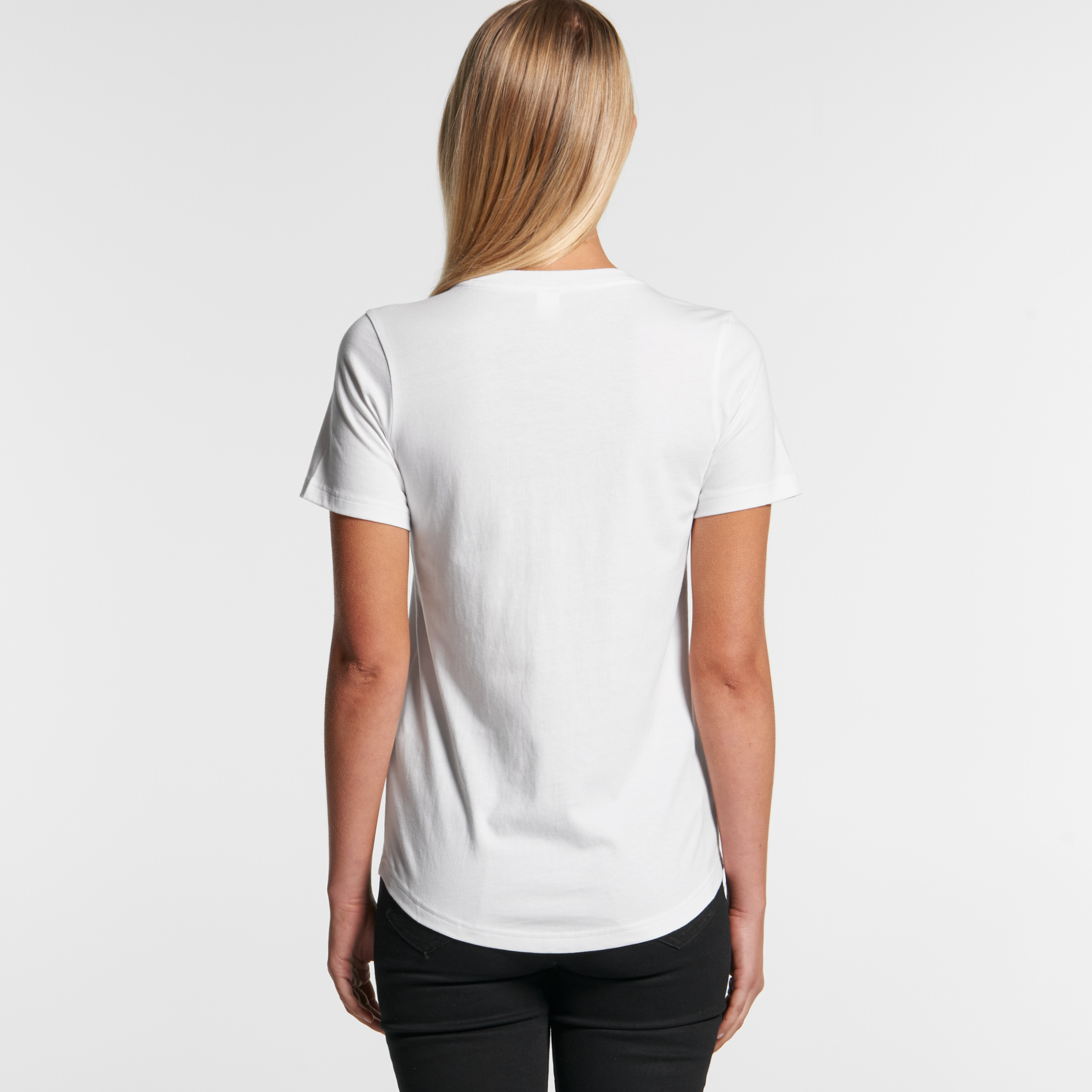 Women’s regular fit crew neck tee. Mid weight, 150 GSM, 34-singles. 100% combed cotton (marles 15% polyester). Curved hem, neck ribbing , side seamed, shoulder to shoulder tape, double needle hems, preshrunk to minimise shrinkage