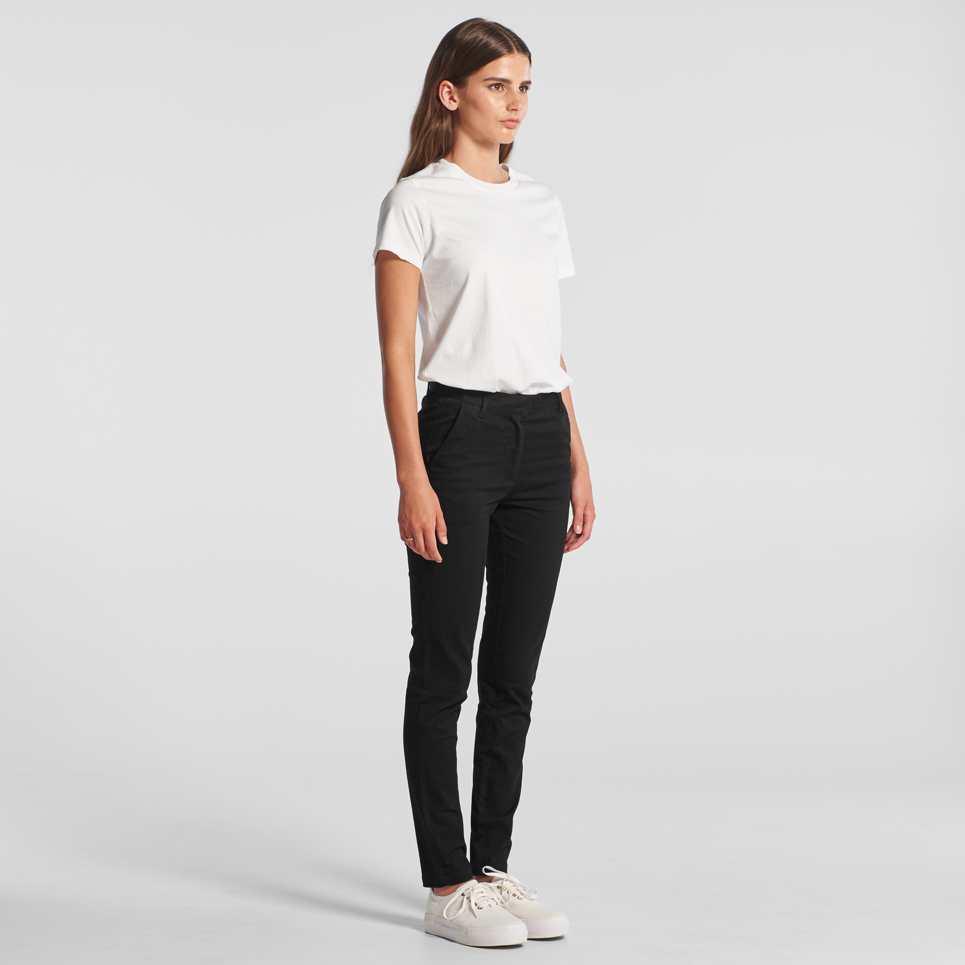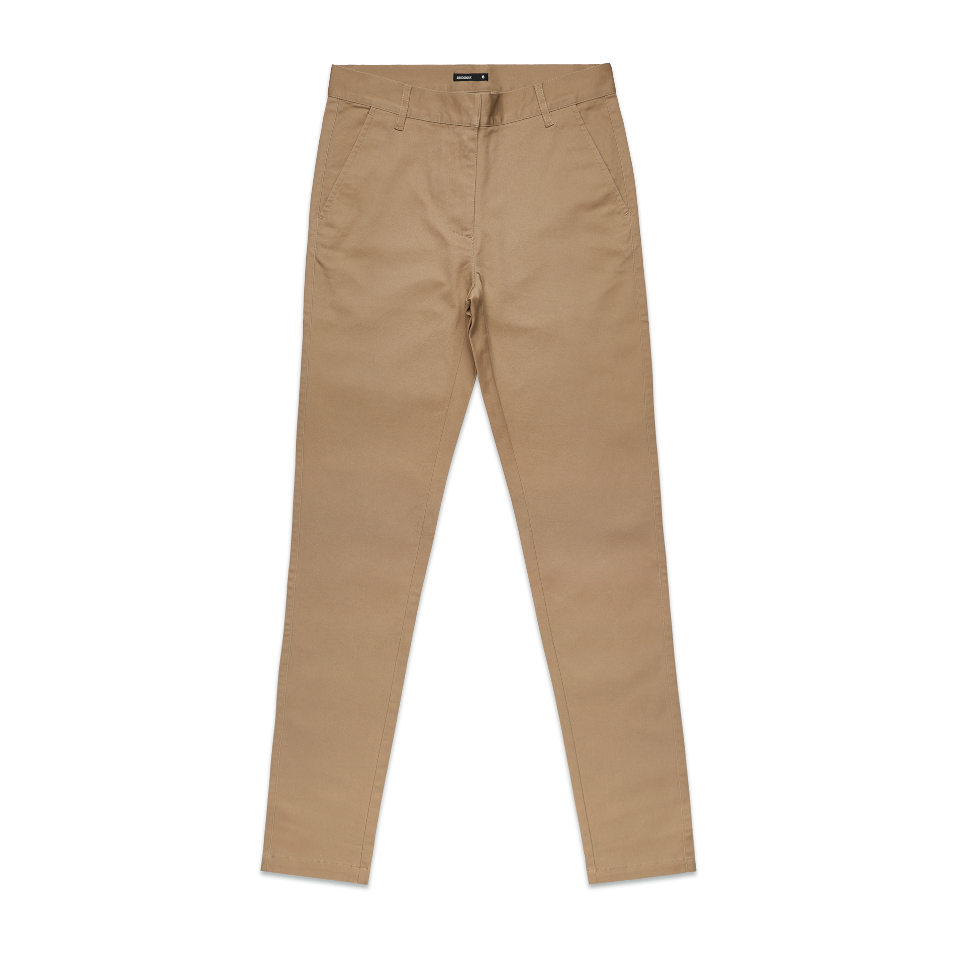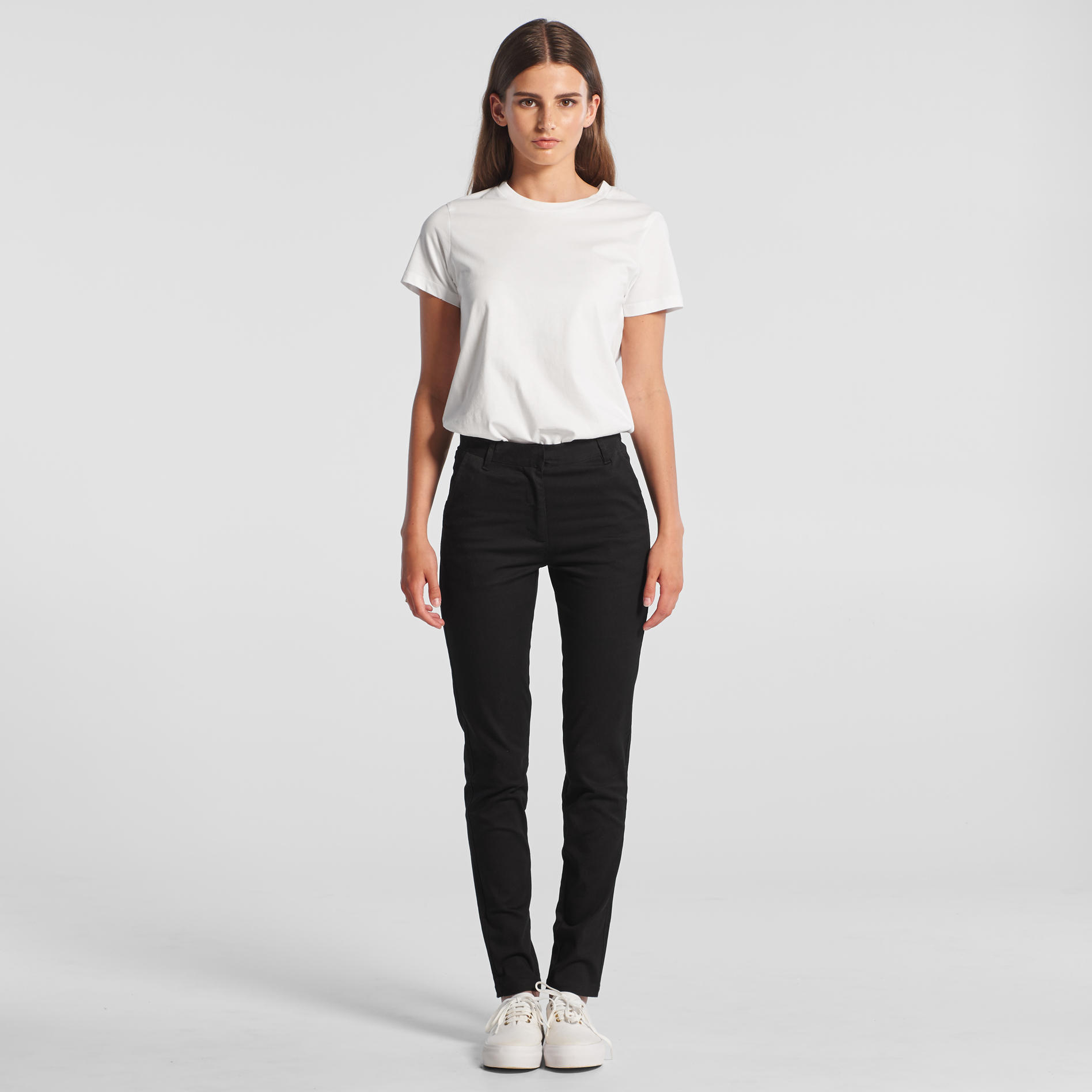 Women’s slim-regular fit pant. Mid weight, 250 GSM 98% cotton 2% elastane. Belt loops on waistband, 2 side pockets, 2 jet pockets at back, Button and hook & eye closure, anti-brass metal YKK zip fly, preshrunk to minimise shrinkage