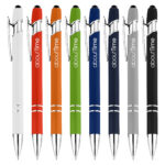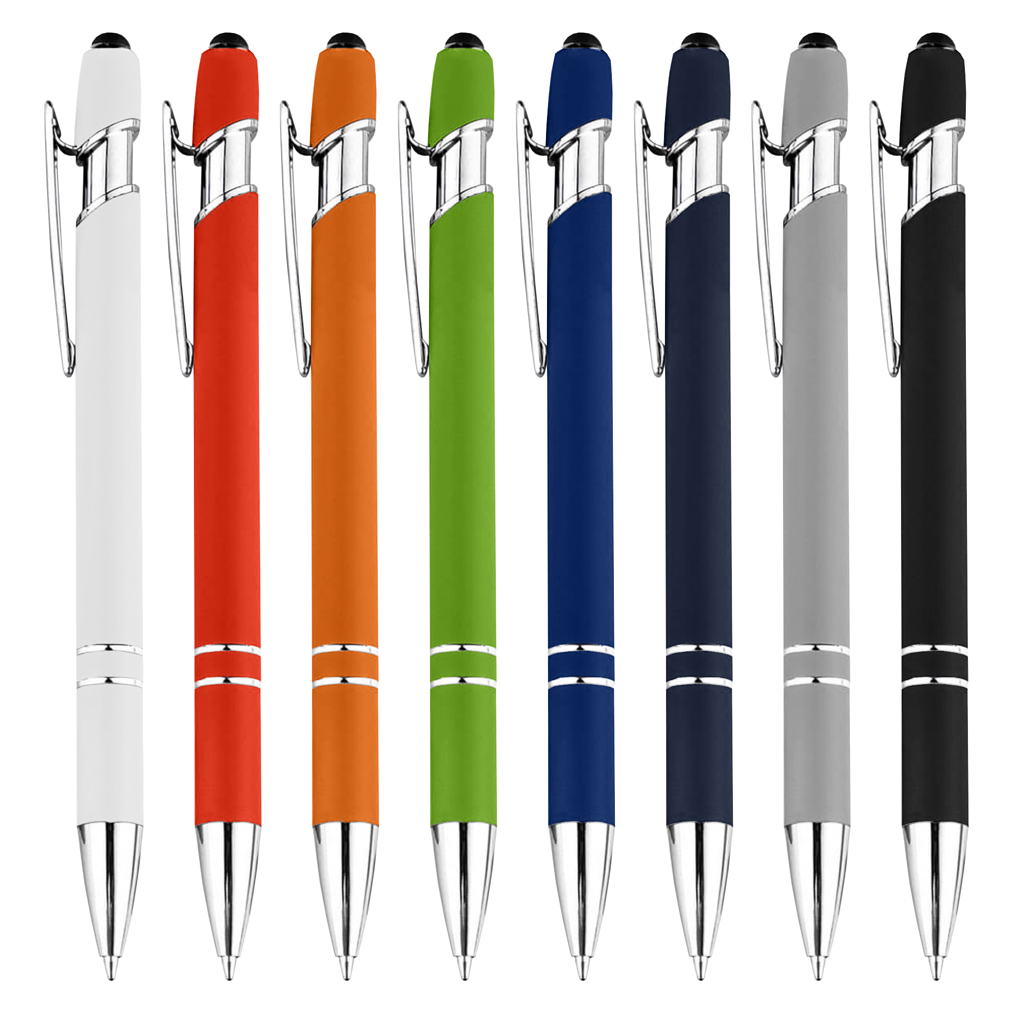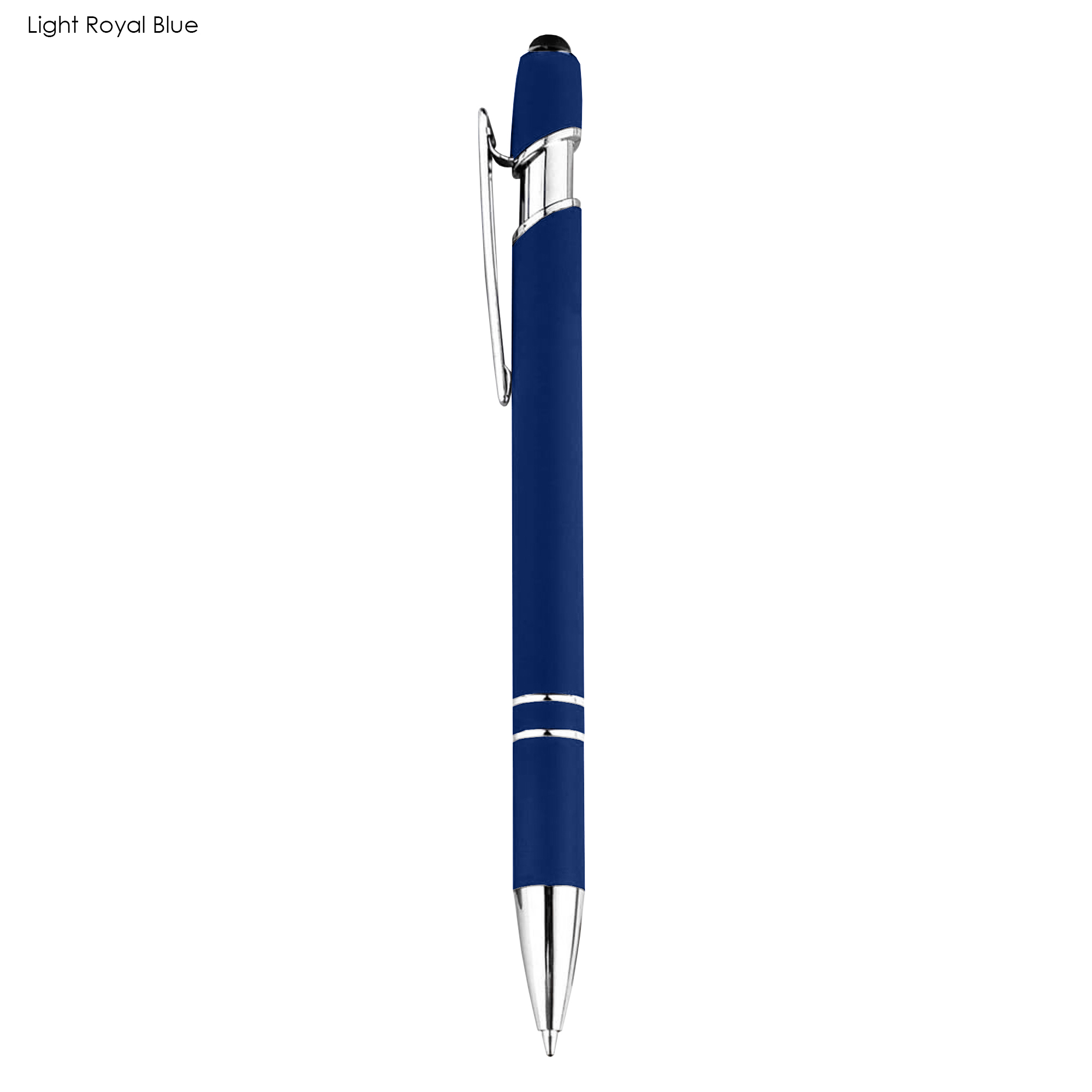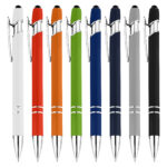Retractable aluminum stylish design pen with a shiny silver chrome trim, soft rubberised barrel in a range of colours and a stylus black top for touch screens. Click action with plastic Cross-Type German manufactured black ink refill, 1200 meters writing distance, tungsten carbide ball provides you with quality writing. Comes standard with black ink, but blue ink is available on request at additional costs.