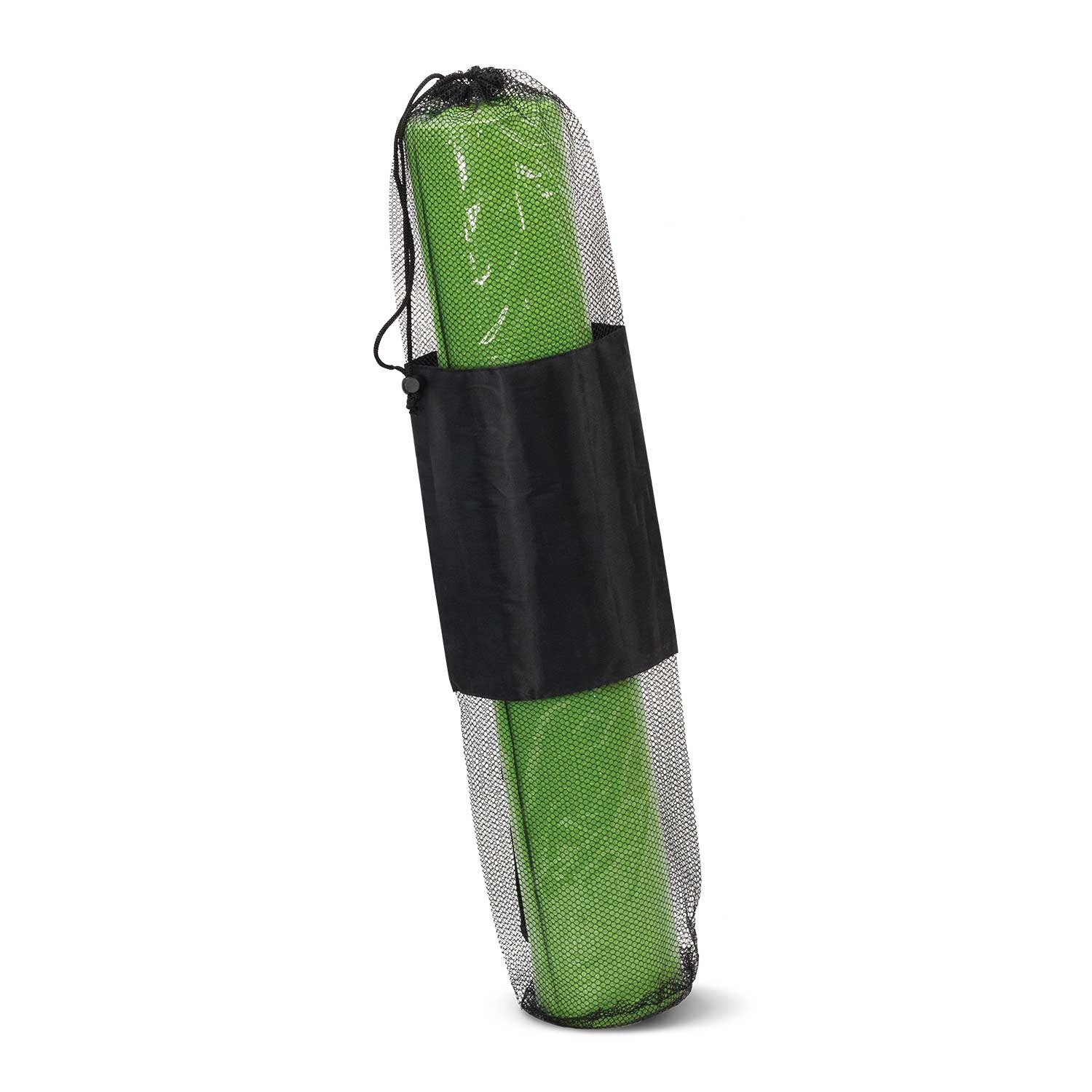 Soft yoga mat which has its own compact mesh carry case with a drawstring closure and an adjustable shoulder strap. Branding is available on the carry case.