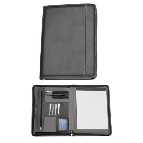 A4 size zippered compendium in Koskin leather-look material with white stitching and grey EVA material contrast panels inside