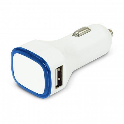 Dual car charger with a 3.1 Amp output that will charge two phones at once. It has a translucent LED insert that lights up when it is in use. Check out our range of Zodiac products. They can be customised with full colour branding and the choice of eight different coloured translucent inserts.